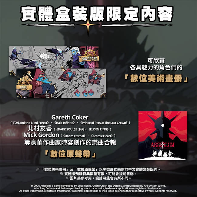 ARC SYSTEM WORKS ASIA 亚克系统亚洲今日(10/1)公开了预定在Nintendo Switch、PS5、PS4 及Steam 平台推出的Roguelite 横向卷轴动作过关游戏《绝对魔权》中文版实体盒装版的预售资讯。 由热销作品《怒之铁拳4》的开发团队所推出,融合奇幻与动作的新类型「Roguelite 横向卷轴动作过关」游戏《绝对魔权》中,玩家可以不断挑战Roguelike 要素、充满节奏感的战斗,以及以超过10 万字篇幅描绘而成的庞大而深刻的故事。透过知名创作者打造的音乐与压倒性的动画影像,玩家将能够沉浸在《绝对魔权》所展开的奇幻世界之中。 《绝对魔权》中文版上市日期