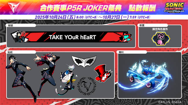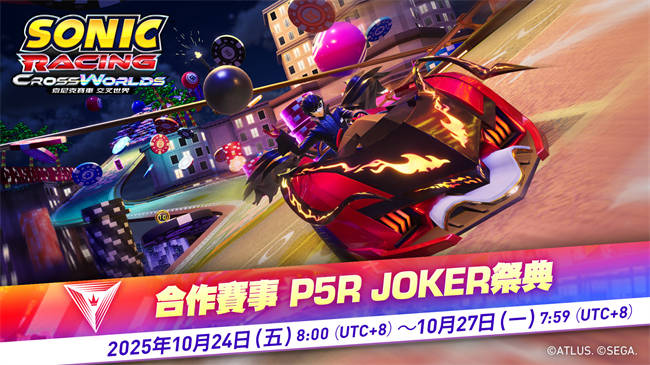 世雅股份有限公司宣布,现正发售中的《索尼克赛车交叉世界》于2025 年10 月23 日(四)开始发布免费更新「JOKER(《女神异闻录5 皇家版》)」,并预计于10 月24 日(五)起举办期间限定的合作赛事「P5R JOKER 祭典」,于赛事期间收集祭典点数,即可获得合作赛事独有的特别游戏道具。 除此之外,官方也宣布《索尼克赛车交叉世界》的全球累计销量已突破100 万套(※1)。 ※1 出自SEGA 的调查结果。销售数量为盒装版出货数、数位版及所有上架平台的贩售数量总和。 【以下内容为厂商提供资料原文】 「JOKER」将透过免费更新参战! 在免费更新中,将新增赛车手「JOKER」和原创赛车「Arsene Wing」。外,《女神异闻录5 皇家版》的3 首歌曲将新增至点唱机。部分歌曲可至点唱机设置为比赛时的BGM。 Arsene Wing 新增歌曲