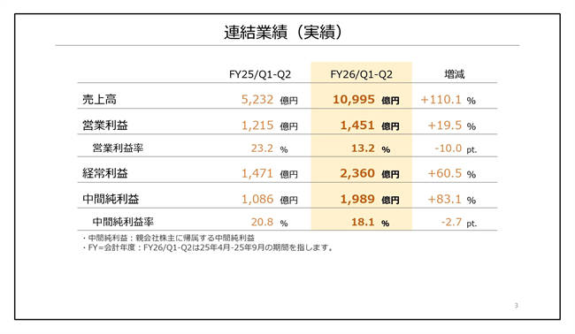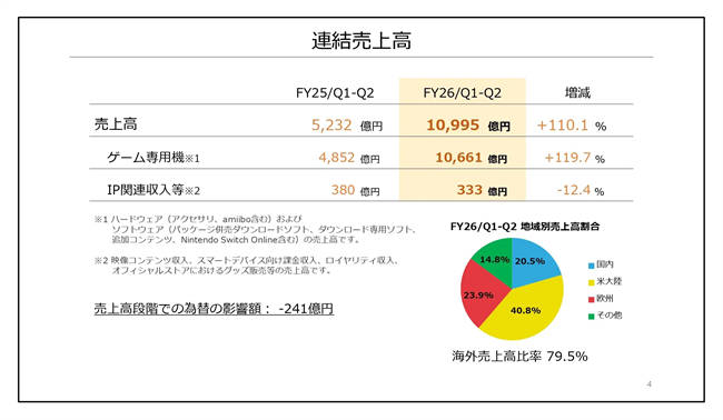 任天堂于11 月4 日公布了2025 会计年度上半年※的财务报告。受到6 月甫上市的新主机「Nintendo Switch 2」热卖的带动,使得游戏主机业务的营业额大幅成长119.7% 来到1 兆661 亿日圆,整体营业额也比前一年度同期大幅成长110.1% 来到1 兆995 亿日圆,中期纯利润大幅成长83.1% 来到1989 亿日圆。 ※ 统计期间2025 年4 月1 日~2025 年9 月30 日 任天堂2025 年度上半年连结业绩数据如下: