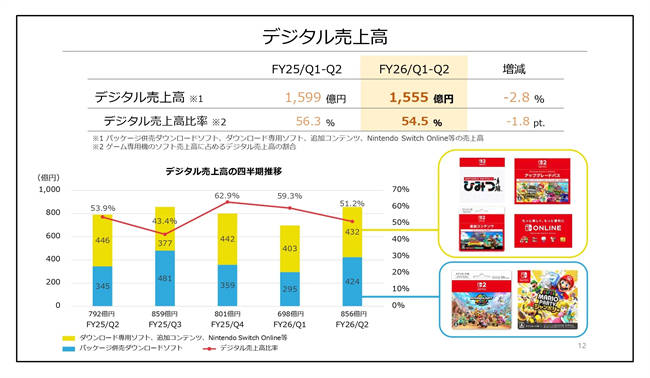 在游戏主机软硬体的销售部分,新推出的Nintendo Switch 2 硬体卖出1036 万台,其中第二季的市场需求相较刚上市的第一季有所冷却,不过仍卖出454 万台,表现依旧强劲。而前一代的Nintendo Switch 受新主机推出世代交替影响,销售量进一步下滑,较前一年度同期减少60.0%,来到189 万台。两者相加的销售台数达1225 万台,较前一年度同期大增159.5%。 Nintendo Switch 2 软体卖出2062 万套。 Nintendo Switch 软体则卖出6156 万套,较前一年度同期减少12.4%。两者加总为8218 万套,较前一年度同期增加16.9%。 其中6 月随Nintendo Switch 2 主机同步推出与同捆贩售的《玛利欧赛车世界》卖出957 万套,安装比例高达92.4%。次为7 月推出之《咚奇刚蕉力全开》的349 万套。热卖多年的《玛利欧赛车8 豪华版》在系列新作推出的状况下,依旧卖出137 万套,名列第三。配合Nintendo Switch 2 推出强化版的《超级玛利欧派对空前盛会》卖出116 万套,位列第四。 Nintendo Switch 2 软体的销售中,有810 万套是随主机同捆贩售。 数位销售的营业额为1555 亿日圆,较前一年度同期减少2.8%。 任天堂同时调整了2025 会计年度预估连结业绩与Nintendo Switch 2 / Nintendo Switch 软硬体预估销售。营业额上修18.4% 来到2 兆2500 亿日圆,营业利润上修15.6% 来到3700 亿日圆,Nintendo Switch 2 硬体销售上修26.7% 来到1900 万台,Nintendo Switch 2 软体销售上修6.7% 来到4800 万套。 Nintendo Switch 硬体销售下修11.1% 来到400 万台,Nintendo Switch 2 软体销售上修19.0% 来到1 亿2500 万套。