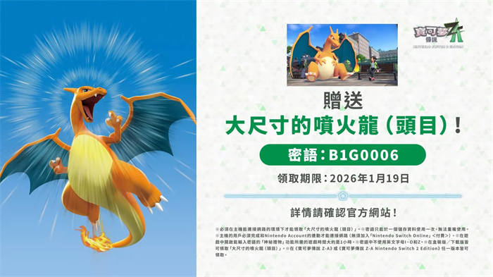 The Pokémon Company 宣布,为庆祝《宝可梦传说ZA超次元爆涌》的新增故事/新增内容即将在12 月10 日上午开始,即日起开始赠送「大尺寸的喷火龙(头目)」。和体型比一般来得更大且实力坚强的喷火龙,一同踏上密阿雷市和异次元密阿雷的冒险旅程吧! 领取喷火龙的方法 只要在《宝可梦传说ZA》游戏中的「神秘礼物」选择「透过序号/密语接收」即可领取「大尺寸的喷火龙(头目)」。 期间: 2025 年12 月9 日22:00~2026 年1 月19 日7:59(台湾香港时间) 密语: B1G0006 ※ 若要领取「大尺寸的喷火龙(头目)」,无须购买付费新增内容《宝可梦传说ZA超次元爆涌》。 只要玩家在ZA 登峰战达到一定的级别,本次赠送的喷火龙就会乖乖听话,成为冒险中的强大队友。与喷火龙一起努力登上A 级吧! 喷火龙 等级:36 招式:日光束、喷射火焰、龙爪、空气斩 ※ 必须在主机能连接网路的环境下才能领取「大尺寸的喷火龙(头目)」。 ※ 密语只能于一个储存资料使用一次,无法重复使用。 ※ 主机的用户必须完成和Nintendo Account 的连动才能连接网路(无须加入Nintendo Switch Online(付费))。 ※ 在游戏中开启能输入密语的「神秘礼物」功能所需的游戏时间大约是1 小时。 ※ 密语中不使用英文字母O、I 和Z。 ※ 在盒装版/下载版皆可领取「大尺寸的喷火龙(头目)」。 ※ 在《宝可梦传说ZA》或《宝可梦传说ZA Nintendo Switch 2 Edition》任一版本皆可领取。 透过「级别对战」来获得蜥蜴王、火焰鸡和巨沼怪的超级石吧! 经由连线对战「Z - A Battle Club」和全世界的人们随机对战的「级别对战」。在自己的级别提升时可获得的「升级报酬」中,蜥蜴王、火焰鸡和巨沼怪的超级石会依序登场。和全世界的训练家们较量宝可梦对战的实力,来获得报酬吧。 在《宝可梦传说ZA超次元爆涌》新增故事/新增内容中,可以遇见蜥蜴王、火焰鸡和巨沼怪。 预定能透过升级报酬获得的超级石 赛季 5