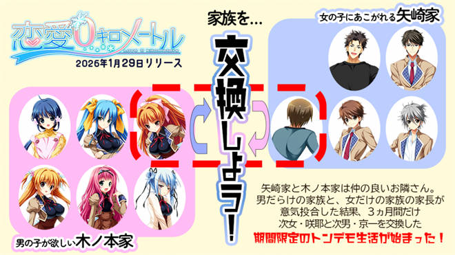 美少女游戏品牌「kawaiinium」公开品牌系列第3 弹作品《恋爱0 公里》的Nintendo Switch 页面,同时宣布本作的Steam 和Switch 版本发售日期确定为2026 年1 月29 日(四)。 《恋爱0 公里》为ASa Project 的第4 部作品,于2011 年10 月推出了PC 版,是一款恋爱冒险视觉小说游戏,游戏的结局会因为玩家的选择而改变。官方表示,本作以「家人」为主题,故事描写主角与住在隔壁的青梅竹马之间的交流,内容有大量搞笑桥段,另外,与先前kawaiinium 品牌所推出的游戏一样,本作也预计将画面进行高画质处理,并支援多语言(繁体中文/简体中文/日语/英语)。 故事概要 矢崎家与木之本家彼此为邻。由四兄弟与父亲组成的矢崎家,一直渴望能有个女儿;而由五姐妹与母亲组成的木之本家,则梦想能有个儿子。某天,双方家长突然提出一个天马行空的想法「我们互相交换家中一位小孩,一起生活三个月试试看吧」就这样,矢崎家的次男京一与木之本家的次女咲耶,开始住进彼此家里,展开了一段交换家人的生活。 木之本家个性鲜明的女生们在迎接京一的同时,虽然一开始对于叫他「葛格」感到别扭,却也渐渐敞开心房接纳了他。而另一方面,京一虽然对于全家都是女生的热闹日常生活感到不知所措,但在一起生活的过程中,也慢慢地被从未体会过的温暖家庭氛围所吸引。然而,三个月的期限正一天一天地逼近,在这段交换家人的生活中,京一和咲耶,以及双方家人们,都逐渐意识到对方对自己而言有多重要。究竟他们最后会回到原本的生活吗?还是会做出不一样的选择呢? 角色介绍