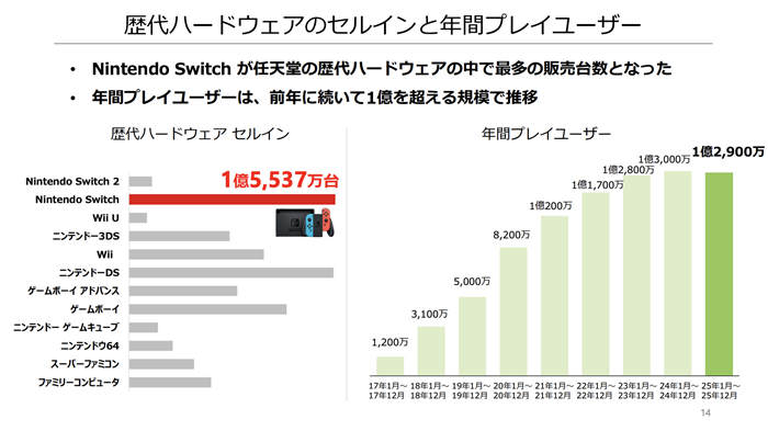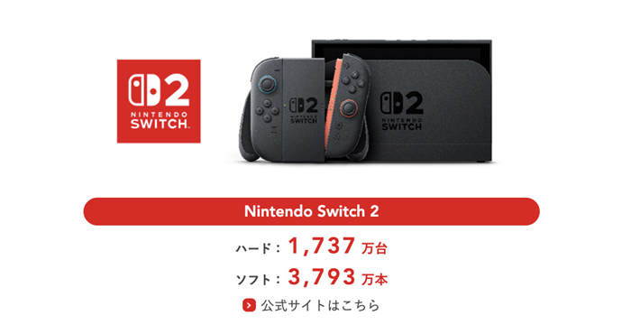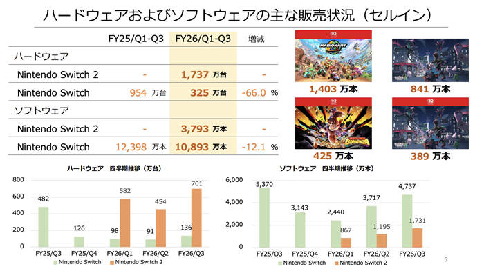 任天堂公布财报资料,指出截至2025 年12 月底,Nintendo Switch 全球累计销售台数已达1 亿5537 万台。此数字正式超越过去任天堂历代主机中销量最高的Nintendo DS(1 亿5,402 万台),使Nintendo Switch 成为任天堂史上销量最高的游戏主机。 同时,Nintendo Switch 软体的全球累计销售量也达到15 亿16 万套。尽管主机推出多年,软体销售依然维持稳定表现,显示每台主机平均购买多款游戏的高使用率,长期维持在相当水准。 在Nintendo Switch 销量刷新纪录之际,次世代主机Nintendo Switch 2 也持续成长。 Nintendo Switch 2 上市后创下任天堂历来「最快卖出1,500 万台」的销售速度纪录,截至2025 年12 月底的累计销售台数(出货量)已达1,737 万台。 财报说明资料中亦公开本期百万销量自家作品的销售情况。在Nintendo Switch 2 平台方面,《玛利欧赛车世界》本期累计卖出1,403 万套,其中日本335 万套、海外1,067 万套,展现全球市场的强劲销量。 此外,《咚奇刚蕉力全开》卖出425 万套,《宝可梦传说ZA Nintendo Switch 2 Edition》卖出389 万套,《卡比的驭天飞行者》则销售达176 万套,显示Switch 2 平台作品成为本期软体销售的重要推手。 在Nintendo Switch 平台方面,多款第一方作品同样达成百万销量。 《宝可梦传说ZA》本期累计销售841 万套,《超级玛利欧银河2》销售242 万套,《超级玛利欧银河》销售228 万套。而《玛利欧赛车8 豪华版》本期再添239 万套,全球累计销售已达7,059 万套。 |