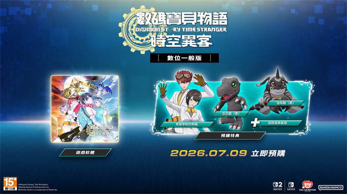 万代南梦宫娱乐宣布,系列作品史上PlayStation 5/Xbox Series X|S/STEAM 版全球累积销量最快突破100 万套的培育型RPG《数码宝贝物语时空异客》,即将在2026 年7 月9 日推出Nintendo Switch 2/Nintendo Switch 版,并且对外公开商品详细情报。 【以下内容为厂商提供资料原文】 玩家将可以随时随地享受本作中由人类及数码宝贝所交织而成、引人入胜的壮阔剧情,超过450 只数码宝贝的培育,以及战略性编组为关键的回合制战斗所带来的乐趣。 享受支援4K 与HDR 的画质模式以及最高60 fps 的效能模式 在Nintendo Switch 2 版中,玩家将可以选择画质优先的「画质模式」,或是影格率优先的「效能模式」。 「画质模式」将能够支援4K 及HDR,「效能模式」则是最高可达60 fps。 购买Nintendo Switch 版的玩家也可以在套用更新资料后,以与Nintendo Switch 2 版相同的画质游玩,亦可选择「画质模式」或「效能模式」。 ※ TV 模式仅限使用有支援4K、HDR 输出的电视才能以4K、HDR 影像的规格进行游玩。 ※ 手提模式也能启用HDR 影像进行游玩。 此外,预计在Nintendo Switch 2 版中加入的模式选择功能也将于日后加入现已发售的PlayStation 5/Xbox Series X|S/STEAM 版中。 详情将于日后于官方网站发布,请持续关注以获得更多消息。 公开版本情报 实体版首批特典/数位版预购特典 首批购买实体版或预购数位版的玩家将可以获得实体版首批/数位版预购特典,其中将包含可培育的数码宝贝「亚古兽(黑)」与「加布兽(黑)」、服装「某间学校的制服」,以及可以在冒险刚开始时派上用场的「冒险道具套组」。 除此之外,首批购买实体版的玩家更可获得「数码宝贝卡牌游戏」的卡片「埃癸奥兽」。 喜爱的玩家千万不可错过。 数位终极版、数位豪华版 数位版本则是除了一般版以外,还有包含收录了追加数码宝贝与章节组合包的「季票」等数位内容的「数位豪华版」,以及包含季票与服装组合包等各式数位版特典的「数位终极版」。 喜爱的玩家将可立刻前往预约。 《数码宝贝物语时空异客》游戏简介 在追查世界毁灭谜团的过程中,一面享受横跨人类世界与异世界的冒险,并搜集培育超过450 只数码宝贝的RPG。 故事的舞台是日本东京。主角身为秘密组织的探员,根据某个指令正在调查新宿时,遇见了未知的生物「数码宝贝」,并被卷入一场神秘的爆炸中。 恢复意识时,世界已经回到了8 年前—— 阻止即将到来的崩坏,执行改变命运的任务。