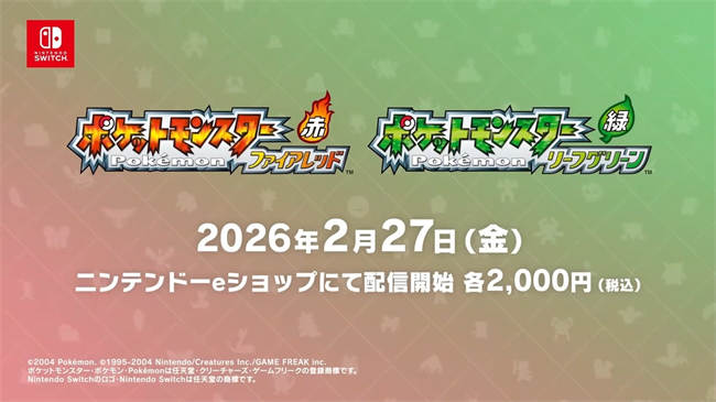 The Pokémon Company 于今日(2/20)宣布,《宝可梦火红》以及《宝可梦叶绿》Nintendo Switch 版将于2 月27 日晚间发售,于同日22:00 公开的「Pokémon Presents」播出结束后开放下载。 本作是把2004 年在Game Boy Advance 发售的《宝可梦火红/ 叶绿》在Nintendo Switch 上完整重现的作品。因此,语言也沿用当时版本,游戏内不支援更改语言。 《宝可梦火红/ 叶绿》是以《宝可梦红/ 绿》为基础全面更新图像,于2004 年针对Game Boy Advance 推出的重制作品。作品中新增了原版不存在的「七岛(ナナシマ)」。 目前两款作品的商店页面均已公开,价格各为含税2000 日圆。另外,在海外的商店页面上,也存在两作皆「预计支援《Pokémon HOME》」的记述。 此外,预定于日本时间2 月28 日上午10 时发售的「特别版」中,似乎会附上游戏本篇、重现当年设计的包装,以及玻璃制的精灵球摆饰。该特别版分为《火红》与《叶绿》版本,价格各为含税1 万9800 日圆。 |