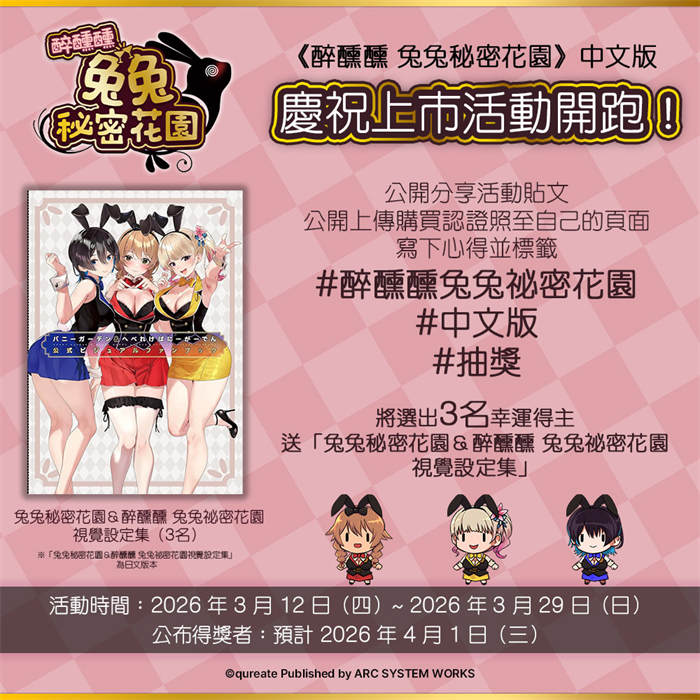 亚克系统亚洲(ARC SYSTEM WORKS ASIA)宣布,qureate 公司旗下的醉步蹒跚动作游戏《醉醺醺兔兔秘密花园》Nintendo Switch 中文版于今日(12 日)上市,并举办庆祝上市活动。 《兔兔秘密花园》为曾经迷倒全球绅士、掀起话题热潮的作品,其番外篇确定将以动作游戏形式《醉醺醺兔兔秘密花园》推出。在本作中,玩家将操作因酒醉而步伐东倒西歪的前作女主角,一边克服回家路上接连不断的各种危机,一边努力护送她平安返家。过程中不仅能体验层出不穷的突发状况,回到家后还能体验充满魅力的夜间日常。 【以下内容为厂商提供资料原文】 《醉醺醺兔兔秘密花园》中文版庆祝上市活动 为庆祝《醉醺醺兔兔秘密花园》中文版上市,从今天起举办抽奖活动。公开上传中文实体盒装版购买认证照或是游玩游戏的画面并留下关于本作的感想,就有机会得到「兔兔秘密花园&醉醺醺兔兔秘密花园视觉设定集」。抽奖活动详情如下。 活动时间:2026 年3 月12 日(四)起至2026 年3 月29 日(日) 活动奖品:「兔兔秘密花园&醉醺醺兔兔秘密花园视觉设定集」(预计抽3 名) ※ 「兔兔秘密花园&醉醺醺兔兔秘密花园视觉设定集」为日文版本 活动参与办法: 点击亚克系统亚洲粉丝专页赞。 公开分享该活动贴文。 将《醉醺醺兔兔秘密花园》中文版购买认证照公开上传至自己的「个人Facebook」动态,写下对本作的感想,同时标签#醉醺醺兔兔秘密花园#中文版#抽奖 ※ 参加活动前请详阅活动办法。 ※ 购买认证照可上传购买之游戏软体照、能够证明购买的照片等,请勿使用非本人的图片参与活动,经主办单位发现或经第三人检举,则主办单位有权取消使用者之参与、得奖资格,主办单位不另行通知。 ※ 购买认证照请公开上传到「自己的Facebook 上」,若未上传到自己的Facebook 视同未参加活动。 ※ 请勿以人头帐号、分身假帐号重复留言,若使用者以人头等假帐号或电脑骇客程式等不正当之手段参与活动,经主办单位发现或经第三人检举,则主办单位有权取消使用者之参与、得奖资格,主办单位不另行通知。 公布得奖者:2026 年4 月1 日(三)于亚克系统亚洲官方社群媒体公布。 《醉醺醺兔兔秘密花园》游戏介绍 故事 为了抚慰绅士们每日疲惫心灵的乐园「兔兔秘密花园」,在它营业时间结束后,展开了另一段故事……。 今晚,花奈、凛、美羽香三人也如往常一样,在兔兔秘密花园度过了愉快的时光。只不过,这次她们似乎喝得比平时稍微多了一点点。 脑袋昏昏沉沉,步伐也东倒西歪……。即便如此,她们还是要回到家里,只为了明天能再次带着笑容迎接绅士们的到来。 然而,就在她们抱持着这样的心情踏上归途时,各种突发状况却在回家的路上接踵而至! 花奈、凛、美羽香,3 人究竟能否平安回到家中呢! ? 角色 假名(CV:星谷澪) 新人服务员。 个性天真烂漫,能够以开朗、温柔的态度待人。 靠着爽朗的笑容疗愈客人。为了实现梦想,不顾父亲反对的坚持搬来东京生活。 凜(CV. 铃木惠理) 个性自由奔放又和蔼的服务员。 不会和客人毕恭毕敬,都以朋友口吻说话。与外表相反,其实是超爱看动漫的宅宅。喝醉后会大肆畅谈自己喜欢的动漫。 Miu Ka(CV:田泽真澄) 口无遮拦,已有无数客人惨遭无情言语的利刃而心碎。但是本人绝对没有恶意。和比自己年纪小很多的妹妹一起生活,肩负扶养妹妹的责任。担任服务员的资历比其他两位还要长。 主要游戏系统 喝到醉醺醺的服务员,究竟能否平安回到家中! ? 玩家的任务就是操作摇摇晃晃的角色,平安把她送回家!在连直线都走不稳「醉步蹒跚」的状态下,闪避潜伏在夜晚街道中的各种危险吧! 接连不断的突发状况! 一头栽进垃圾桶里动弹不得、屁股卡在人孔盖里出不来……! ?克服接二连三袭来的麻烦,护送东倒西歪的服务员平安到家吧! 搭载PTA 系统(Panties Tactically Acquired 收集・超多・内裤吧)! 回家路上不知道为什么掉满了各种内裤……! ?捡到的内裤可以直接更换!当然,设定上回家后都有好好洗干净再穿的,不必担心卫生问题!搜集丰富的设计款,体验专属于你的内裤穿搭!这就是本作独创的「PTA(Panties Tactically Acquired 收集・超多・内裤吧)」系统! 回到家中,沉浸在女孩们的夜间日常时光! 以醉醺醺的状态直接扑进床里?那可不行!为了明天也能在兔兔秘密花园奉上最棒的服务,必须做好万全准备。舒展身体的瑜伽、放松身心的泡澡时光。最后用化妆水仔细护肤。这才是专业服务员的夜间日常!只要在关卡中拿到高分,就能解锁服务员们在家里的私密日常场景!来挑战高分吧! 穿上你喜欢的服装回家吧! 满足特定条件,就能解锁全新服装!宽大的男友衬衫、经典的兔女郎套装等,款式应有尽有。让她换上你最喜欢的装扮,体验一场特别的回家之旅吧! 关于Nintendo Switch《醉醺醺兔兔秘密花园》中文版的详细资讯可以透过亚克系统亚洲(ARC SYSTEM WORKS ASIA)的官方网站及社群媒体得知。 游戏资讯