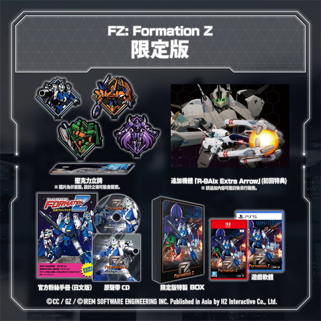《FZ: Formation Z》实体盒装版初回特典DLC 追加机体《R-9Aix Extra Arrow》 《R-TYPE》的「R-9」不仅能变形为机器人,还能使用象征性的「FORCE」特殊兵器,在《FZ: Formation Z》的战场上展现全新战术魅力。也包含在游戏内客制化性能中可使用的2 种贴纸。 ※ 该追加内容可能日后另行销售 欲了解关于《FZ: Formation Z》的更多资讯,可前往官方网站、Facebook、YouTube、PlayStation Store 或Nintendo eShop 页面查询。